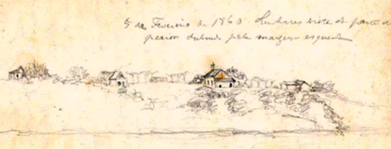 Aos esboços que fazia, Dom Pedro costumava acrescentar referências complementares, escritas com letras miúdas, mas legíveis. No caso do desenho de Linhares, escreveu Dom Pedro: “5 de fevereiro de 1860, Linhares vista da parte superior subindo pela margem esquerda.”